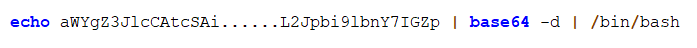 The command contains a base64 encoded string that will be decoded and executed using 'bash':
