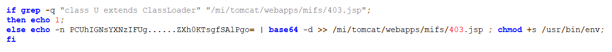 The decoded command first checks whether the webshell already exists in '403.jsp'. If not, it will be appended. Additionally, the command sets the 'setuid' bit to '/usr/bin/env', allowing the threat actor to execute commands with 'root' privileges.