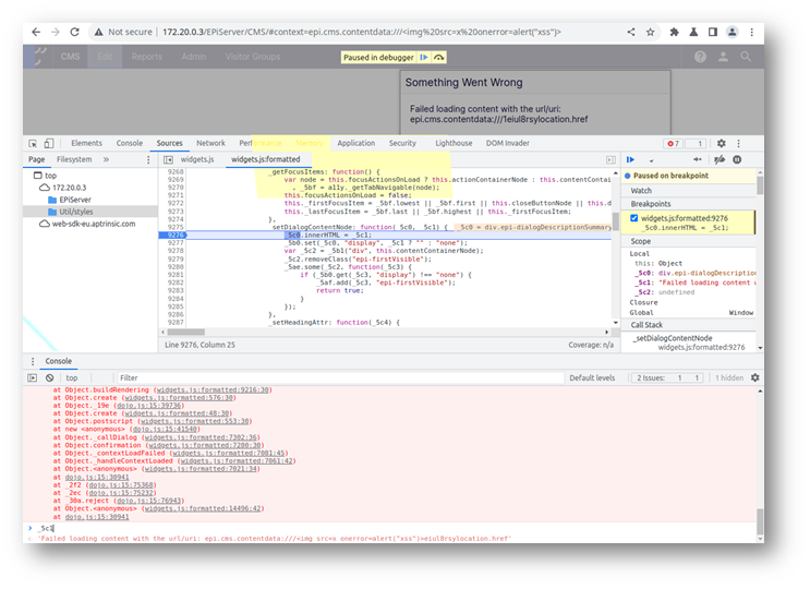 Below is a debugging session where the attacker-controlled input reaches the vulnerable sink in widgets.js: